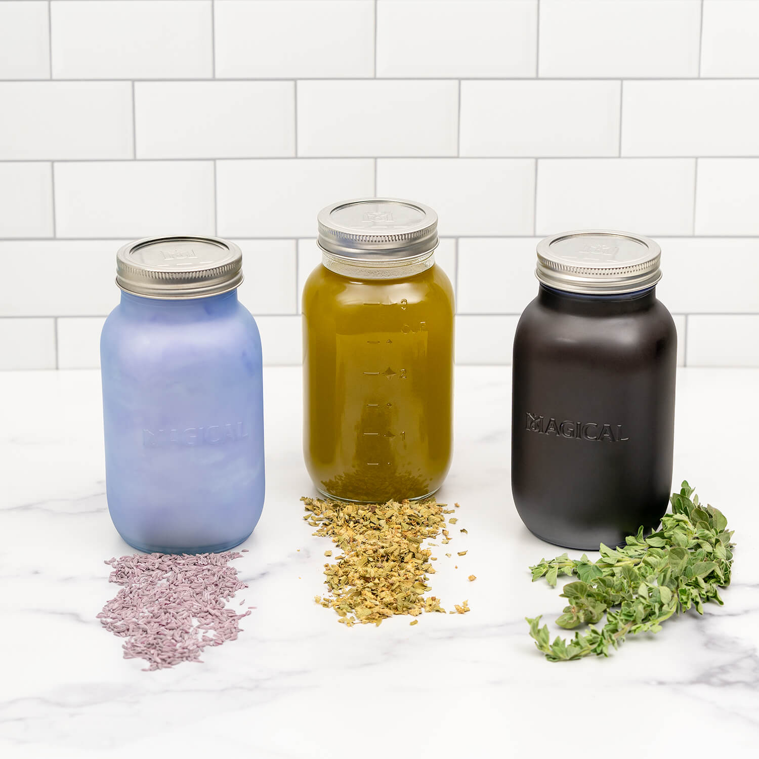Magical branded mason jars are your solution to canning, storage, & displaying all your infusions! This glass jar set comes in a pack of 3 and holds up to 3.5 cups (828ml). Each jar includes an airtight metal lid for freshness, lock-in odors, and seal in flavor! These reusable jars are as versatile as they are multi-purpose. Each mason jar has a transparent glass design. A perfect trio to store your infused base recipes like butter, olive oils, tinctures and can be used to serve up your favorite infused beverages. Already have your infused recipe? These mason jars can be filled with preserves, sauces, jams, or even honey- to name a few!